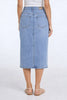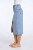 The mid-rise fit creates a flattering, streamlined silhouette, while the longer length adds a refined, versatile feel. A front slit detail enhances movement and gives the design a contemporary touch. Finished with classic five-pocket styling and a button-zip closure, this skirt delivers a clean, polished look that pairs easily with both casual and elevated pieces.