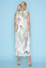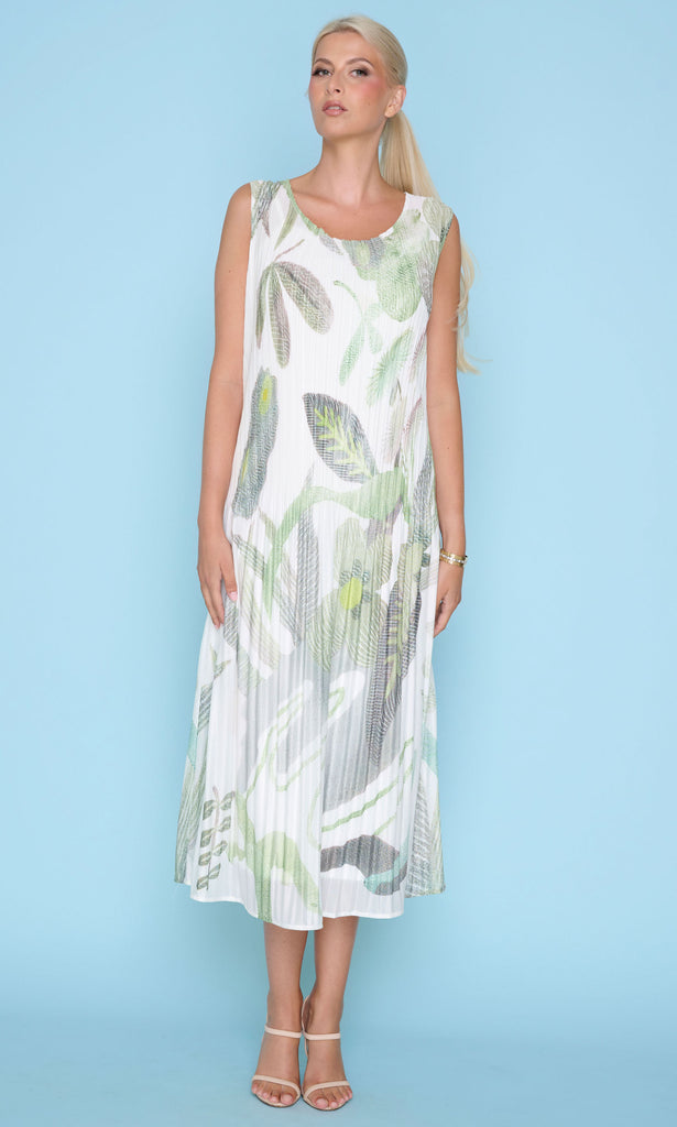 The relaxed silhouette falls gracefully through the body, enhanced by all-over pleating that adds texture and movement. A sleeveless design allows for ease and airflow, while the softly rounded neckline keeps the look clean and refined. The abstract botanical-inspired print brings a fresh, contemporary touch, creating visual interest without overwhelming the design.