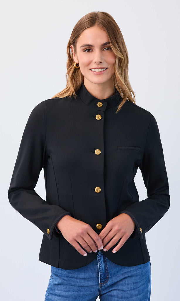 This jacket brings timeless sophistication with a modern, structured silhouette. Tailored to perfection, it features a sleek stand collar and striking gold-tone buttons that lend a refined military-inspired touch. Subtle shaping through the seams enhances the fit, while the minimalist design makes it endlessly versatile—perfect for elevating both denim and dressier looks.