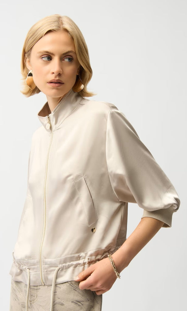 This lightweight jacket blends effortless elegance with modern utility. Crafted with a smooth, satin-like finish, it features a zip-front closure, subtle stand collar, and relaxed three-quarter sleeves for an easy, contemporary silhouette. A softly gathered drawstring hem allows for customizable shape, while discreet pockets add everyday functionality. Perfect for layering, this piece delivers a refined look with a relaxed feel.