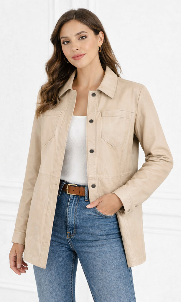 A timeless layer crafted from supple lamb leather. Designed with a clean shirt-jacket silhouette, this piece features structured patch pockets and a snap-front closure for a polished finish. An elevated essential that pairs effortlessly with denim, tailored trousers, or dresses.
