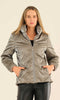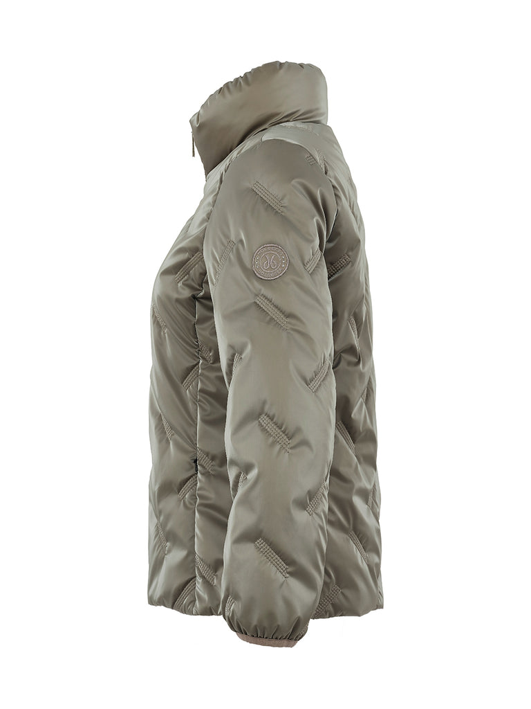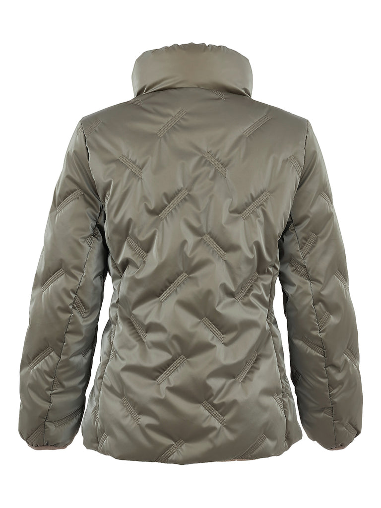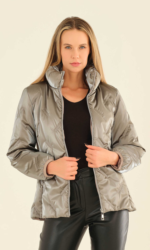 This chic puffer jacket combines contemporary design with elevated detailing. Crafted in a sleek taupe metallic finish, it features an embossed quilted pattern that adds subtle texture and dimension. The high stand collar offers a stylish, structured look while keeping you cozy.