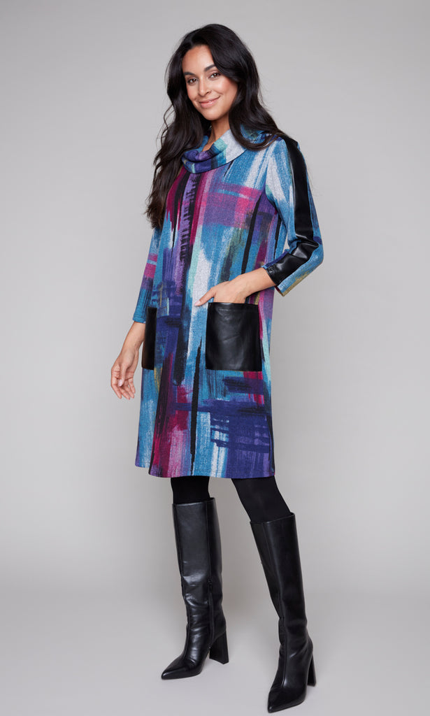 Turn heads with this bold and modern abstract print cowl neck dress. Featuring a vibrant painterly design in rich jewel tones, this dress blends statement style with effortless comfort. Faux leather accents on the sleeves and oversized front pockets add a touch of edgy sophistication, while the soft cowl neckline and straight silhouette create an easy, flattering fit.