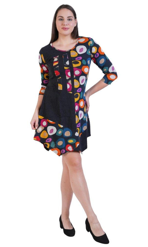 Bring playful energy to your wardrobe with this vibrant multicolor circle print dress. Designed with a mix of bold, artistic circles and solid black paneling, it creates a flattering contrast that stands out. The round neckline with cutout details adds a touch of uniqueness, while the 3/4 sleeves and handkerchief hemline give it a chic, modern finish. Perfect for casual outings or creative styling, this dress is both fun and comfortable.