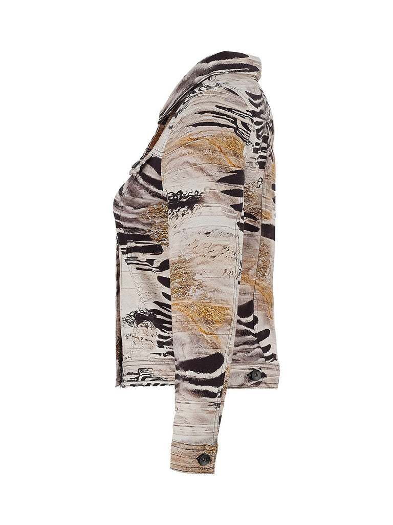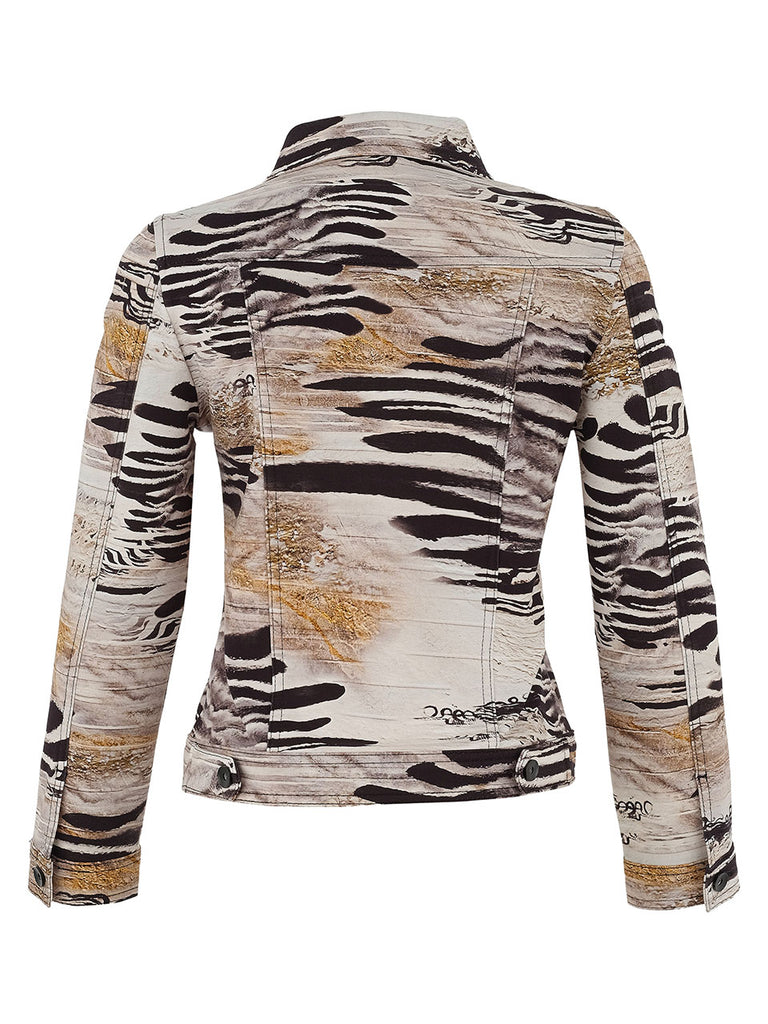 Bring bold energy to your wardrobe with this eye-catching denim-style jacket. Featuring a unique abstract animal-inspired print in tones of black, beige, and golden ochre, it blends edgy style with wearable versatility. Designed with a classic button-front closure, chest pockets, and a tailored fit, it’s the perfect statement piece to layer over casual or polished looks.