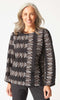 Crafted from a textured black fabric, this statement top features horizontal rows of metallic and neutral-tone embellishments that create a striking visual pattern. The round neckline and relaxed fit lend a flattering, comfortable silhouette. A distinctive button-back closure adds interest and sophistication, making this piece perfect for both special occasions and elevated everyday wear.