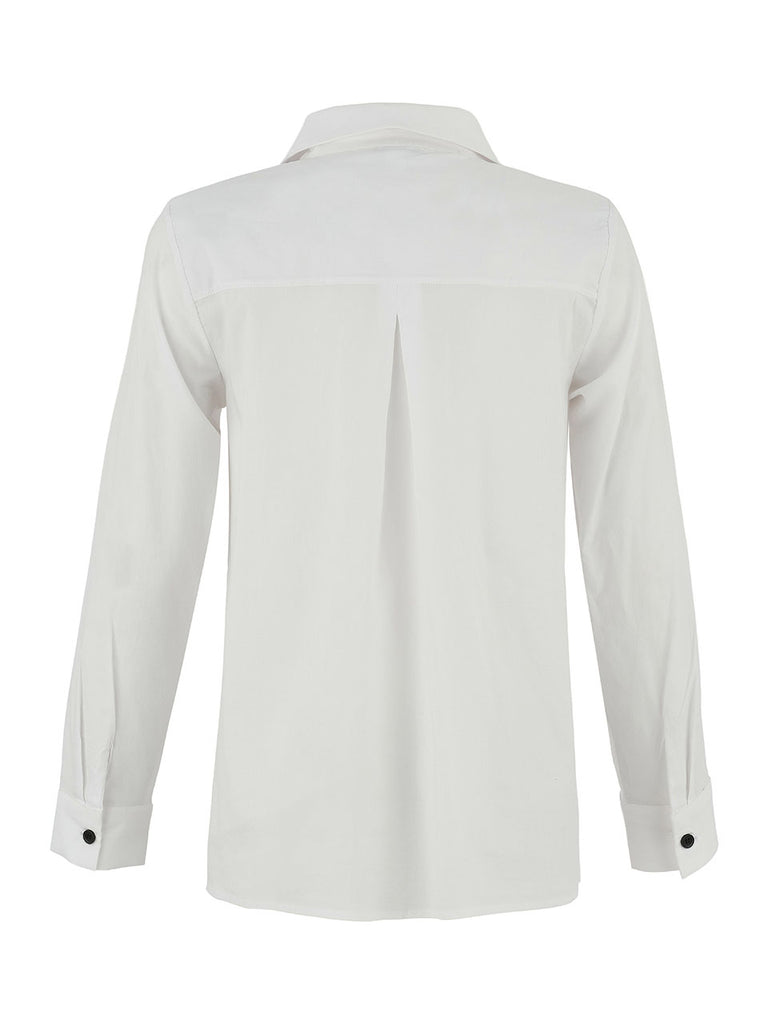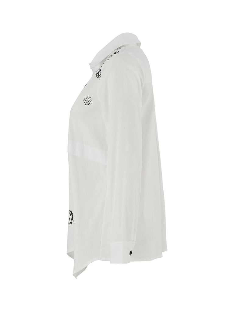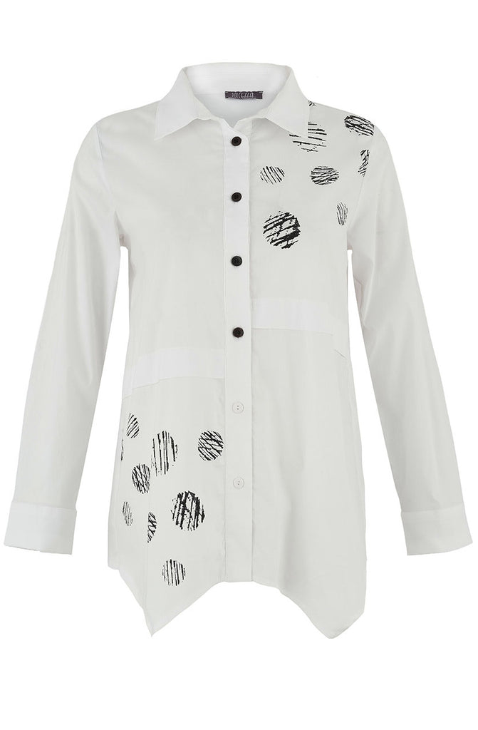 A modern twist on the classic white blouse, this button-down features playful black circle motifs for an artistic edge. Designed with a pointed collar, long sleeves, and a slightly asymmetrical hemline, it blends tailored structure with creative flair. The contrast black buttons add a polished finish, making this blouse an easy statement piece for both work and weekend styling.