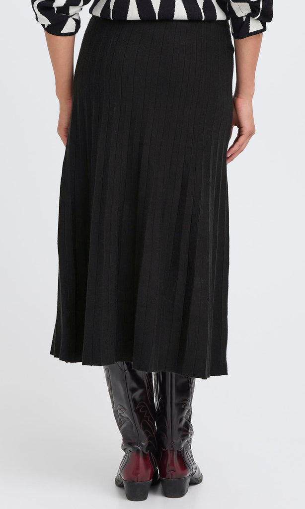 A timeless essential, this black knit skirt offers both comfort and elegance with its softly pleated design. Falling to a midi length, it creates a sleek silhouette while allowing graceful movement. The elastic waistband ensures an easy, flattering fit, making it a versatile piece to style with cozy knits, crisp blouses, or layered outerwear.