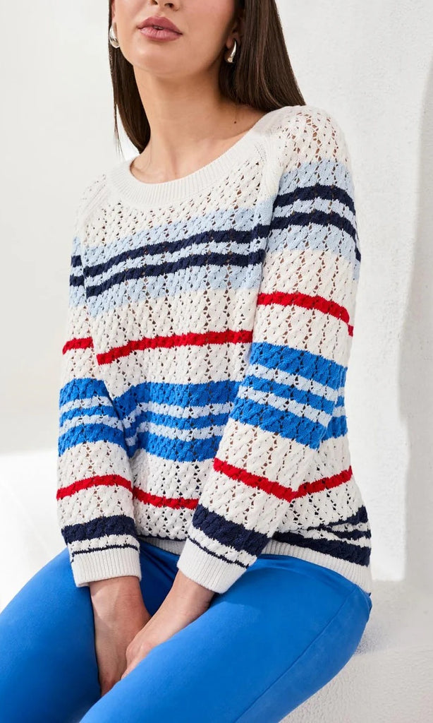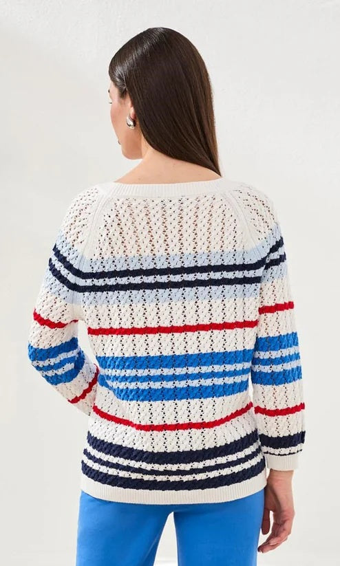 Bold stripes and cable knit detailing elevate a 3/4 sleeve cotton sweater with modern charm. Soft combed cotton offers natural comfort, while the relaxed fit and classic crew neck provide easy layering for breezy spring days or cool evenings.