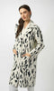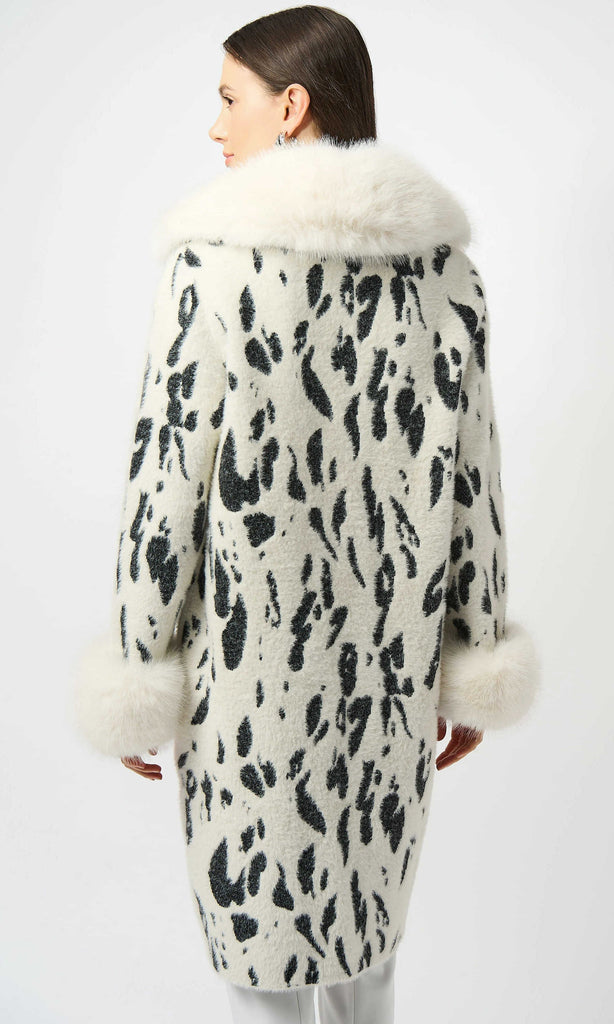 Embrace your wild side with this bold coat, showcasing a striking animal print and luxe faux fur trim at the collar and cuffs. Crafted from feather yarn sweater knit, it boasts an irresistibly soft texture, while the notched collar and straight silhouette exude timeless sophistication. Destined to be a standout in your cold-weather wardrobe, this coat is the perfect blend of daring style and cozy elegance.