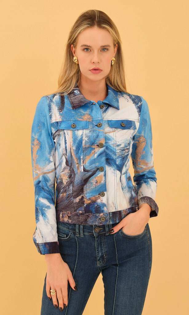 A wearable work of art, this jacket brings bold expression to a classic silhouette. Designed in a timeless denim cut, it features a painterly abstract print in vibrant shades of blue, white, and earthy tan. With a button-front closure, chest flap pockets, and tailored seaming, it blends artistic flair with everyday versatility. Perfect for adding color and creativity to both casual and polished looks.
