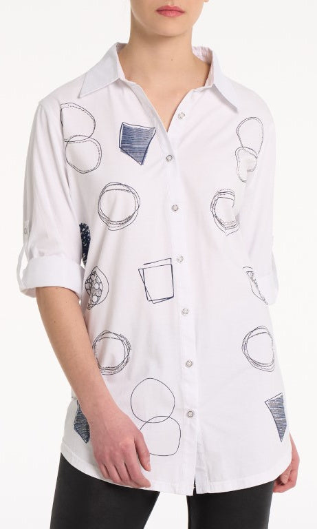 A modern twist on a classic silhouette, this crisp white button-down shirt features abstract embroidered circle and geometric motifs in navy for a playful yet polished look. Designed with a relaxed fit, roll-tab sleeves, and a curved hem, it’s the perfect piece for both casual styling and smart layering.