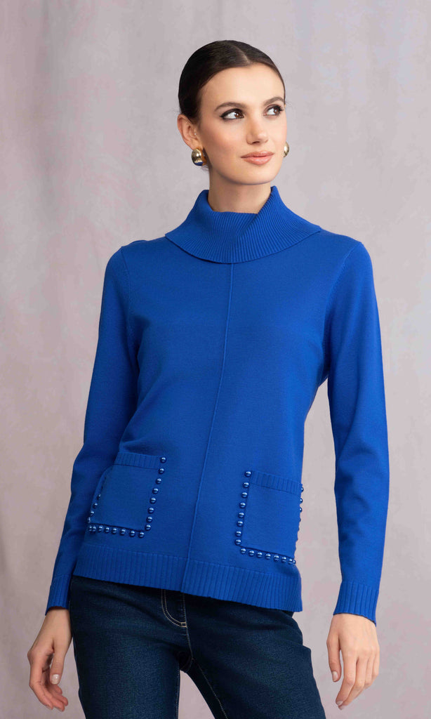 This cobalt blue sweater brings a touch of sophistication with its sleek design and refined details. Featuring a wide mock neck collar and long sleeves, it offers a modern, structured silhouette. Two front patch pockets are accented with tonal bead embellishments, adding a subtle hint of texture and elegance. Perfect for pairing with denim or tailored trousers, this piece transitions seamlessly from casual to elevated looks.