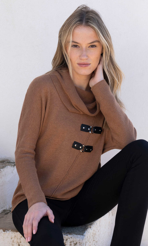 A modern twist on cozy knitwear, this cowl neck sweater features bold buckle accents for a touch of edge. The diagonal front seam draws the eye, while the faux leather buckle straps add standout detail. Designed with ribbed long sleeves and a relaxed fit, it’s an effortlessly chic piece to elevate casual looks.