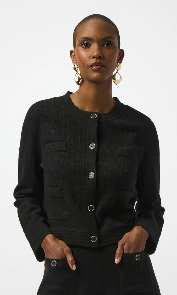 Perfect for work or an elegant dinner out, this sweater knit jacket adds the ideal finishing touch to polish your look. With a classic crew neck, front closure with chic metal buttons, and practical patch pockets, this jacket is the quintessential layering piece every woman’s wardrobe needs.