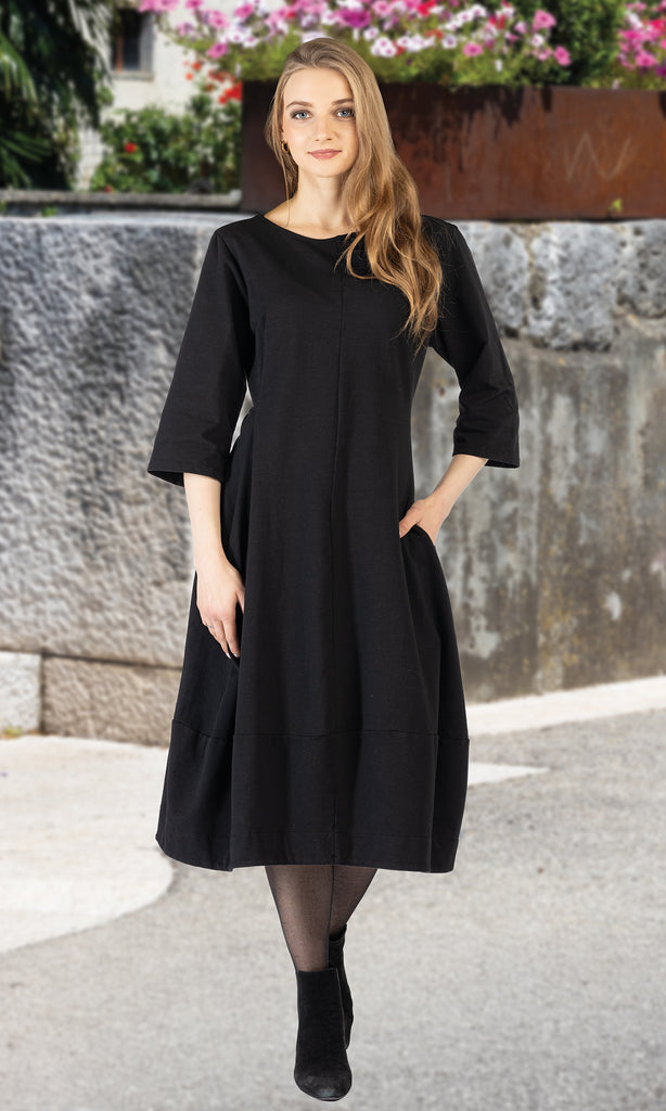 This timeless black dress offers effortless elegance with its clean lines and flattering A-line silhouette. Designed with a simple round neckline, 3/4 sleeves, and a flowing mid-calf length, it’s a versatile piece that works for both casual wear and elevated occasions. Side pockets add a touch of functionality, while the minimalist design keeps the look sleek and modern.