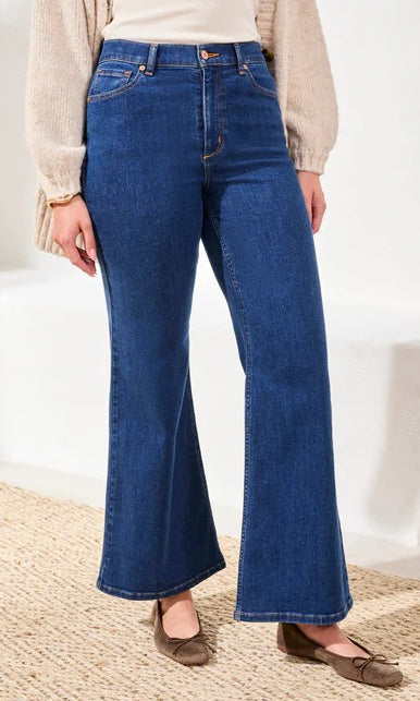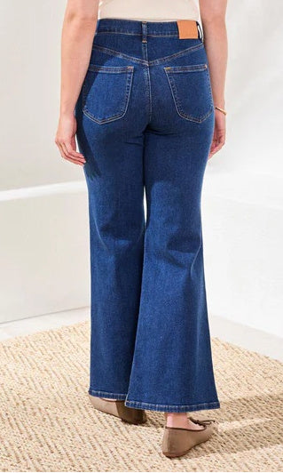 Crafted from innovative super stretch denim fabric, these jeans redefine comfort while maintaining the appearance of classic non-stretch denim. Featuring an airy palazzo leg design, they offer effortless movement and a relaxed feel. With a flattering hugging upper fit, high rise waist, 31" inseam, and practical 5-pocket styling, these jeans seamlessly combine comfort with functional style for everyday wear.