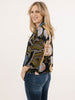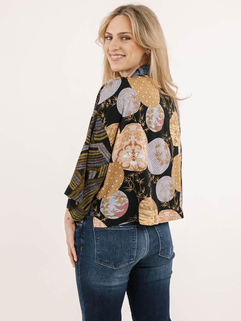 Make a statement with this Asia-inspired mixed-print kimono cardigan, where bold patterns and textures come together in effortless harmony. Designed with wide sleeves and an easy open-front silhouette, it drapes beautifully while showcasing vibrant circular motifs, bamboo accents, and geometric details. The standout feature is the denim trim and patch pocket detail, adding a modern twist to the artistic print. Perfect for layering, this piece blends boho-chic flair with contemporary edge.