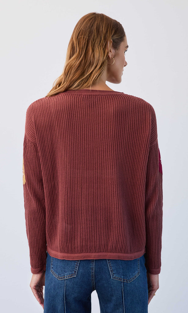 This sweater blends playful charm with easy, everyday comfort. Designed in a rich bronze tone, it features a textured waffle-style knit that adds depth, while scattered floral appliqués in soft pink, mustard, and burgundy bring a fun, handcrafted feel. The relaxed silhouette, rounded neckline, and long sleeves make it an effortless piece to slip into — perfect for adding a touch of personality to your casual wardrobe.