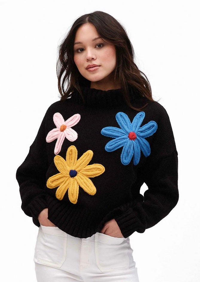 This black sweater features a bold, playful design with oversized 3D floral appliqués across the front — a standout piece that mixes cozy comfort with artistic flair. The chunky knit and relaxed fit make it both stylish and easy to wear, while the bright pink, yellow, and blue flowers add a cheerful, statement-making touch.