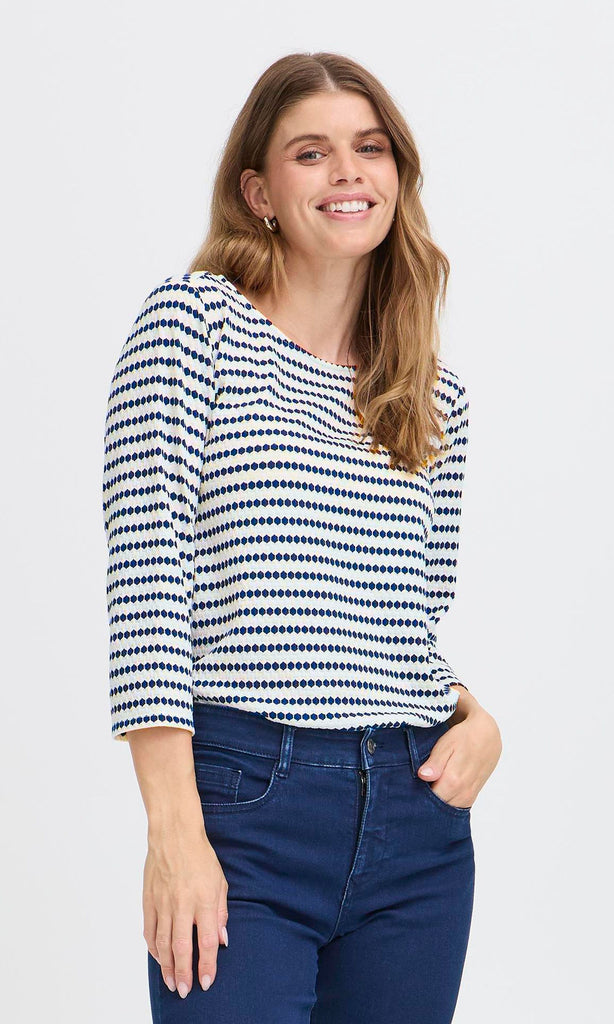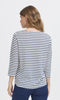 A fresh update on classic stripes, this top showcases a unique hexagon stripe design in navy on a crisp white base. The round neckline and three-quarter sleeves give it a timeless silhouette, while the playful geometric pattern adds a modern twist. Perfect for layering or wearing on its own, this top transitions effortlessly from casual to polished looks.