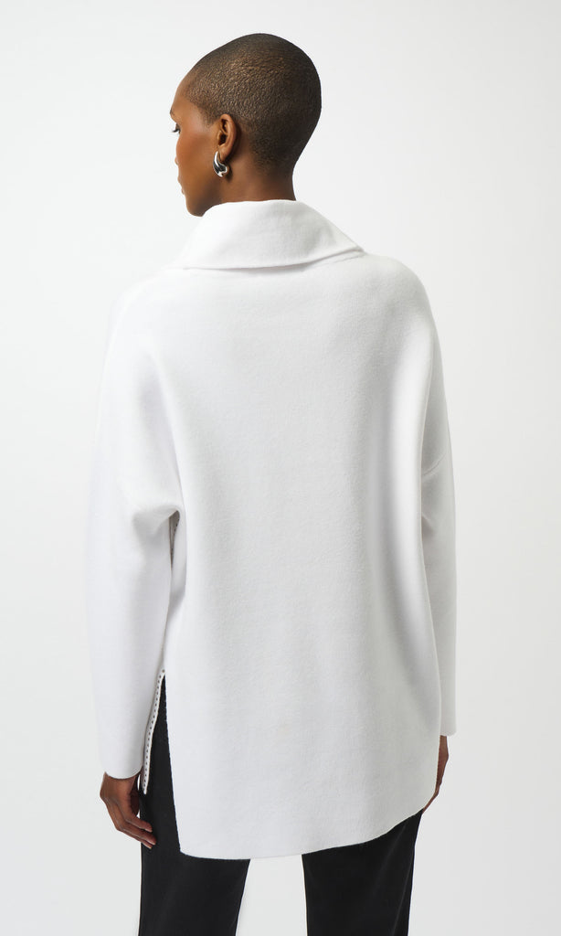 This sweater-knit pullover seamlessly blends comfort and style to make the cooler months more enjoyable. The asymmetrical design adds a sophisticated touch, while the loose cowl neck offers warmth and elegance. Thoughtfully-placed iron-on detailing enhances the look even more, adding a delicate and beautiful touch.