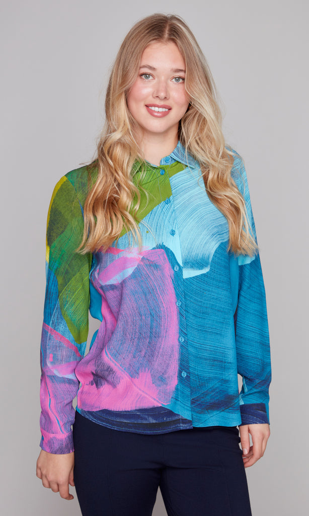 Add an artistic flair to your wardrobe with this vibrant Hi-Lo button down top. Featuring a bold brushstroke print in a mix of bright blues, pinks, and greens, this top is both expressive and elegant. The classic button-front design is elevated with a modern high-low hemline and lightweight fabric that drapes effortlessly. A perfect statement piece for both work and weekends.