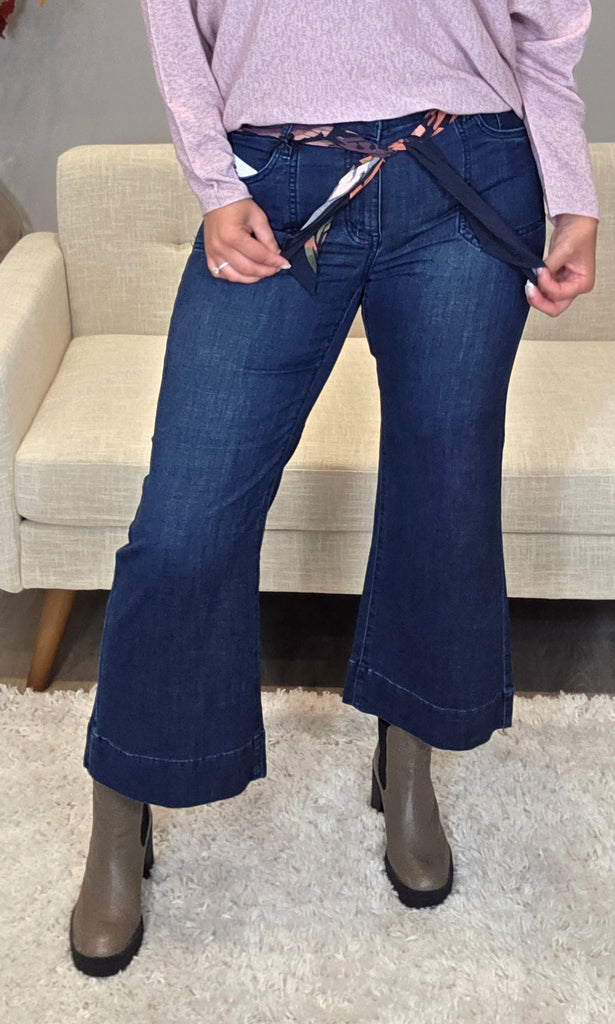 A playful twist on your everyday denim. These mid-rise jeans feature a cropped kick flare leg and come finished with a removable printed scarf belt for a touch of personality. Crafted in soft, stretch denim, they strike the perfect balance between comfort and style — making them a go-to for casual days with a fashionable edge.