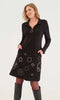 Effortless and modern, this dress combines casual comfort with playful design. Crafted in soft black fabric, it features an A-line silhouette with long sleeves and a collared zip neckline finished with a chic ring pull detail. The skirt is decorated with abstract circle prints in contrasting tones, adding a fun, artistic touch. Complete with side pockets and button-cuff sleeves, this piece is as practical as it is stylish.