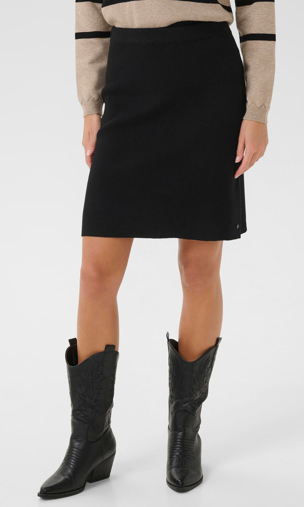 A timeless wardrobe staple, this black knit skirt offers effortless style and versatile wear. Designed in a straight, above-the-knee cut, it provides a flattering silhouette that pairs easily with both casual and dressy looks. The soft knit fabric ensures comfort, while the minimalist design makes it an easy match for patterned tops, cozy sweaters, or structured blouses.