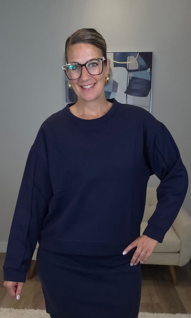 This top is a relaxed crew neck pullover crafted in a solid navy hue for a timeless, minimal look. Designed with a drop shoulder seam and slightly boxy silhouette, it offers a modern, casual aesthetic while maintaining an easy, comfortable fit. The soft knit fabric drapes effortlessly and pairs perfectly with the matching fitted skirt for a coordinated set or with denim for an off-duty look.