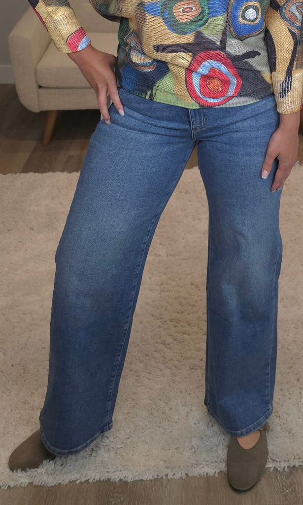 A modern take on a timeless classic — these wide-leg jeans bring effortless sophistication to your everyday denim rotation. Crafted from soft, premium stretch denim, they offer a flattering high-rise fit that smooths through the hips before falling into a relaxed, wide-leg silhouette. The medium-blue wash gives them a polished, versatile look that pairs beautifully with everything from structured blouses to casual knits.