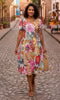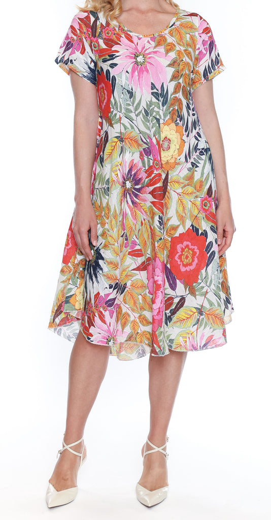 Effortless, breezy, and beautifully feminine — this short-sleeve swing dress is designed to flatter every shape while keeping you cool and comfortable. Available in two stunning floral prints, each version brings its own mood: a bold multicolour palette for standout summer energy, or a soft neutral-and-blue floral for a more understated, timeless look.