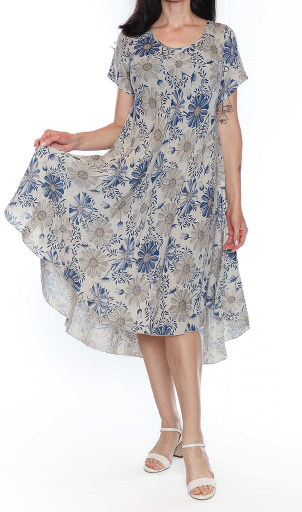 Crafted from linen with an airy drape, it features a classic scoop neckline, relaxed short sleeves, and a flowing A-line silhouette that moves gracefully with every step. The high-low hemline adds natural movement and extra ease, making it a perfect choice for warm days, weekend outings, or vacation styling.