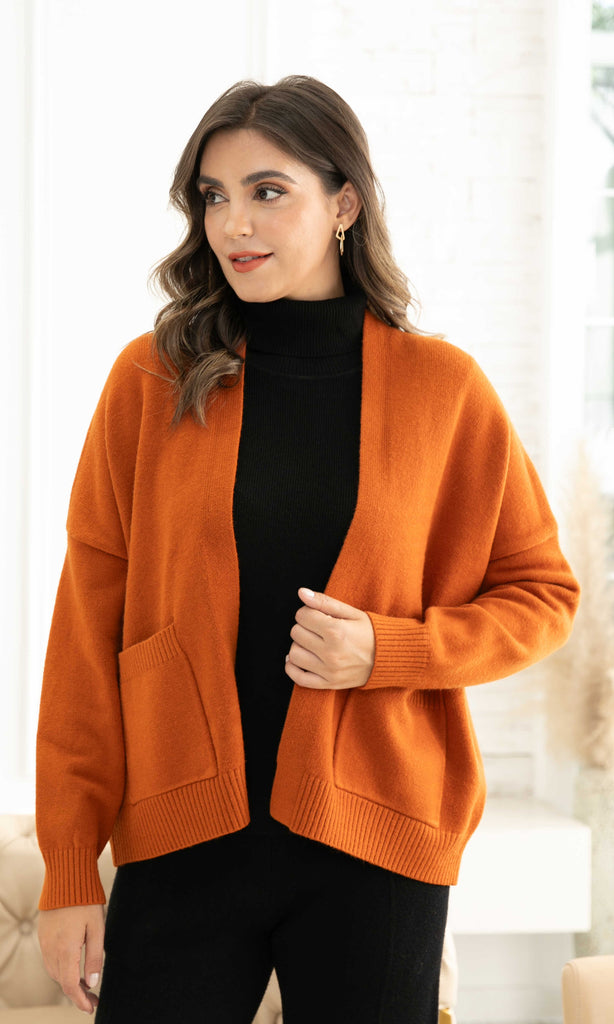 A cozy layering essential in a bold burnt orange shade, this cardigan is designed with an open-front silhouette for effortless wear. Dropped shoulders and ribbed trim enhance the relaxed fit, while front patch pockets add both style and function. Pair it with anything from denim to tailored pants for a versatile, pulled-together look.