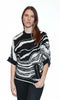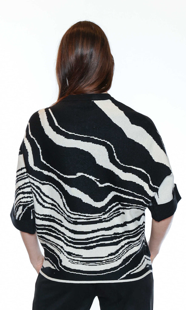 This striking black and ivory knit sweater makes a bold statement with its abstract wave pattern. Designed with a relaxed fit, it features short cuffed sleeves and a round neckline for easy styling. A functional zipper pocket detail adds a modern touch while enhancing its unique edge. Pair it effortlessly with sleek pants or denim for an artistic yet contemporary look.
