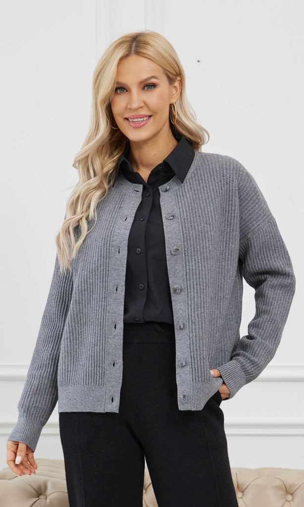 A versatile layering piece with modern texture. This ribbed cardigan features a button-front closure and a crew neckline, making it easy to pair with both casual and polished looks. The structured knit provides comfort and a refined finish.