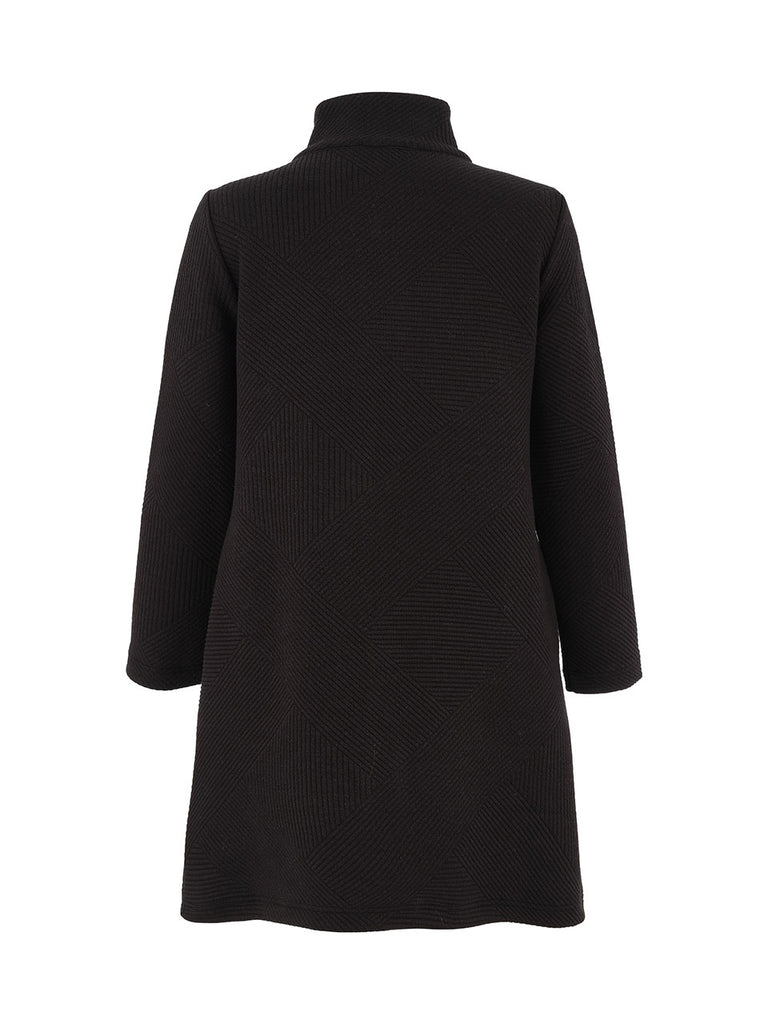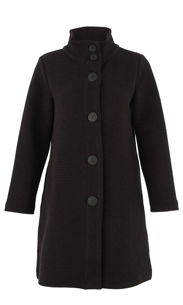 Elevate your wardrobe with this sophisticated black coatigan. Designed in a textured ribbed knit with a subtle geometric pattern, it combines the structure of a coat with the comfort of a cardigan. The high stand collar and oversized buttons lend a modern edge, while the longline silhouette offers both warmth and effortless style. Perfect for layering, this versatile piece transitions seamlessly from day to night.