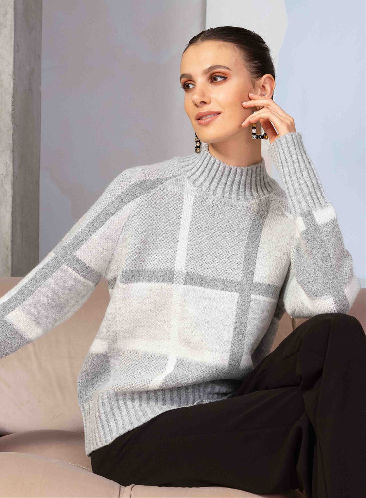 Soft, modern, and effortlessly chic — this mock neck sweater features a subtle windowpane pattern in soft grey and ivory tones. The relaxed silhouette pairs beautifully with ribbed detailing at the neckline, cuffs, and hem, offering a cozy yet refined look. Crafted from a plush knit, it’s perfect for adding understated elegance to your everyday style.