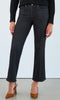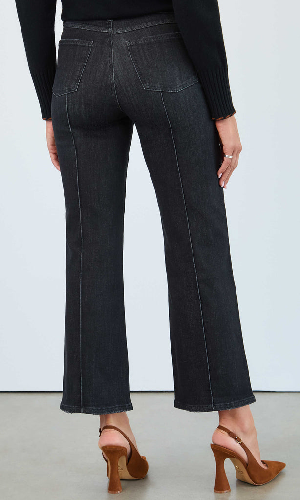 These black-wash jeans offer a sleek, modern update to a classic silhouette. Designed with a flattering straight leg, they feature a distinctive front seam detail that subtly elongates the leg for a refined finish. The soft stretch denim provides comfortable movement while maintaining its shape, making them an effortless choice for both elevated and everyday looks. Finished with classic pocket styling and a lightly flared hem, they blend versatility with a touch of contemporary edge.