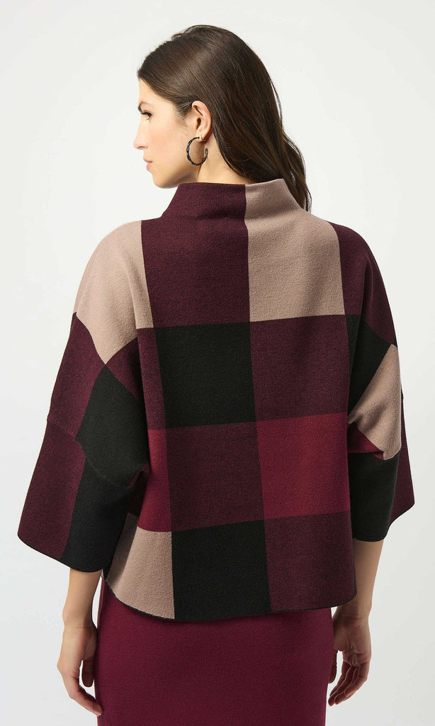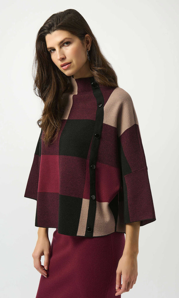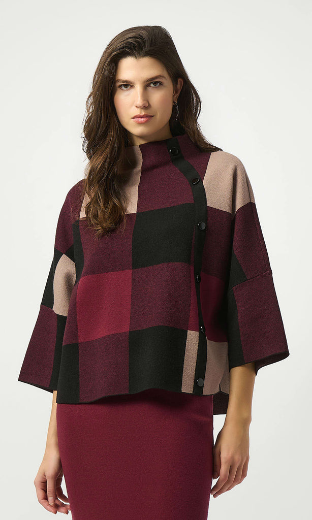 We all need a little plaid in our wardrobe. This cozy jacquard sweater knit top features a striking three-tone plaid pattern that's just as extraordinary as its design. A loose-fitting funnel neck adorned with decorative buttons on the side, along with three-quarter bell sleeves and a roomy fit give this piece an endlessly attractive appeal.