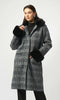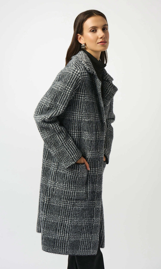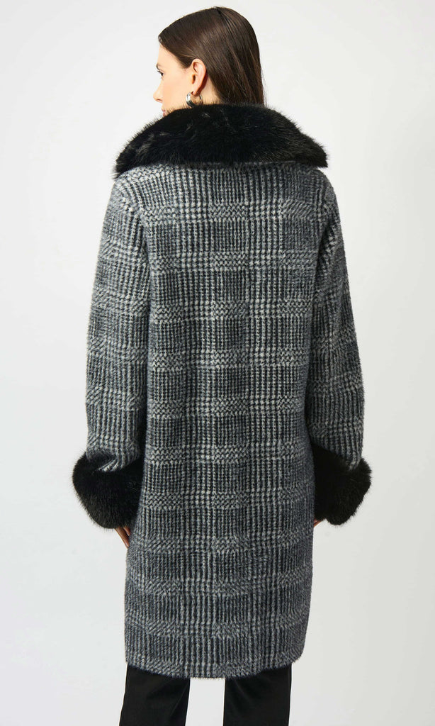 This timeless plaid coat receives a luxurious update with faux fur trim at the collar and cuffs, adding a touch of elegance to its classic design. Crafted from a soft and cozy feather yarn sweater knit, it features a notched collar, front pockets with contrasting trim, and a flattering straight silhouette. A perfect blend of sophistication and comfort for the cooler seasons.