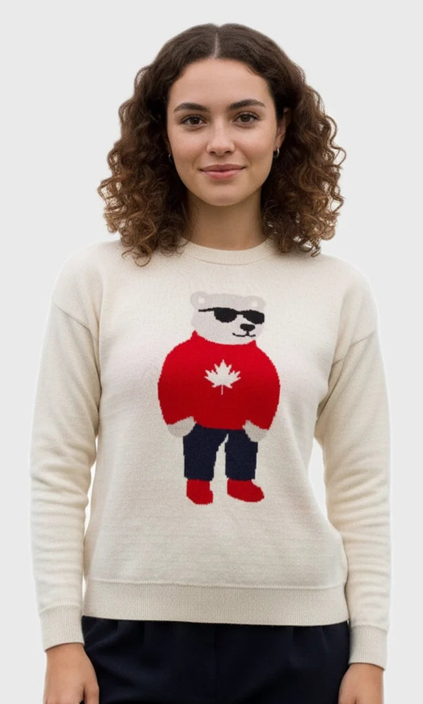 Add a fun, playful twist to your seasonal wardrobe with this charming bear-graphic sweater. Set on a soft white knit, the front features an adorable bear wearing sunglasses, a red maple-leaf sweater, and jeans—bringing a lighthearted Canadian flair to your look. The relaxed fit, dropped shoulders, and ribbed trim create an easy, comfortable silhouette you’ll reach for again and again.