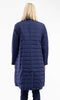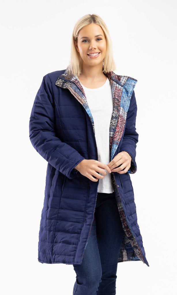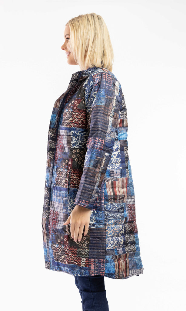 This reversible puffer coat offers two stylish looks in one versatile piece. One side features a sleek solid navy finish for a clean, modern look, while the reverse side showcases a vibrant kantha-inspired patchwork design with rich blues, reds, and earthy tones. Quilted throughout for warmth, this coat is mid-length with a zip-front closure and functional pockets, making it both practical and statement-worthy. Perfect for layering, it balances cozy comfort with bold, artistic flair.