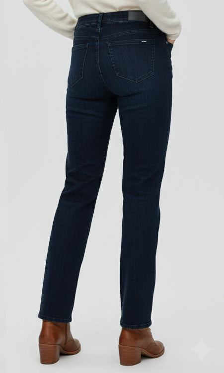 Crafted from premium stretch denim, these jeans provide a comfortable, flattering fit that moves with you. The deep indigo wash gives them a versatile, polished look perfect for everyday wear or a dressed-up casual style. Featuring classic five-pocket styling and a mid-rise waist, they deliver both comfort and sophistication in one effortlessly wearable pair.