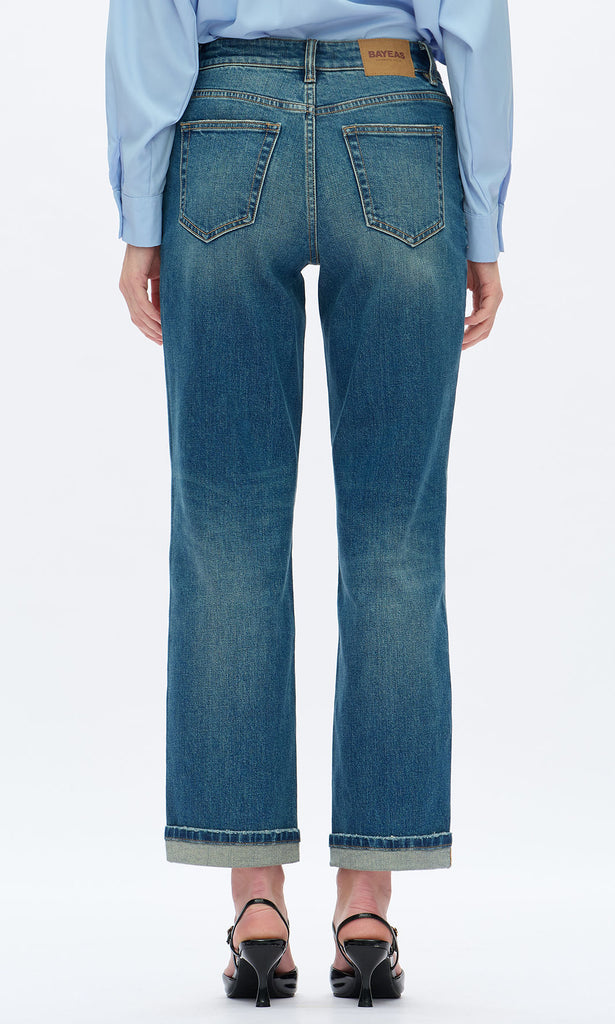 Effortlessly refined, these cuffed straight leg jeans offer a modern take on a timeless silhouette. The medium blue wash with gentle fading flatters every shape, while the cuffed hem adds a polished, casual-chic touch. Crafted from soft, stretch denim for a comfortable fit, this pair transitions seamlessly from day to night with ease.