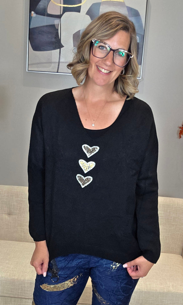 Design Details: Classic V-neckline, long sleeves, straight hem, and sequin-embellished hearts in metallic tones.
