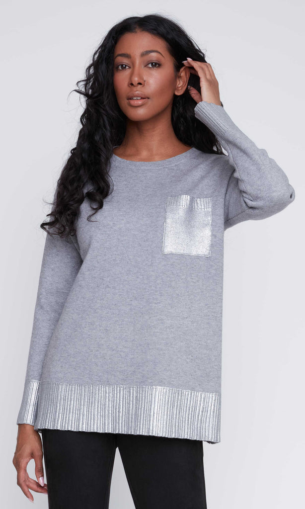 Add a touch of shine to your everyday style with this heather grey sweater. Designed with a relaxed fit, it features a metallic patch pocket detail and shimmering ribbed trim at the hem and cuffs. The soft knit offers comfort, while the metallic accents bring a modern, eye-catching finish.