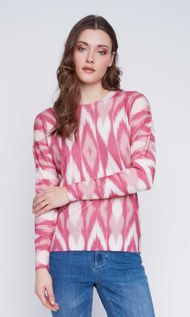 Bright and modern, this pink patterned sweater brings a fresh pop of color to your everyday wardrobe. Featuring an eye-catching geometric print in varying shades of pink and white, it’s designed with a classic crew neckline and a comfortable, relaxed fit. Soft knit fabric makes it perfect for layering or wearing on its own for an easy, stylish statement.