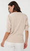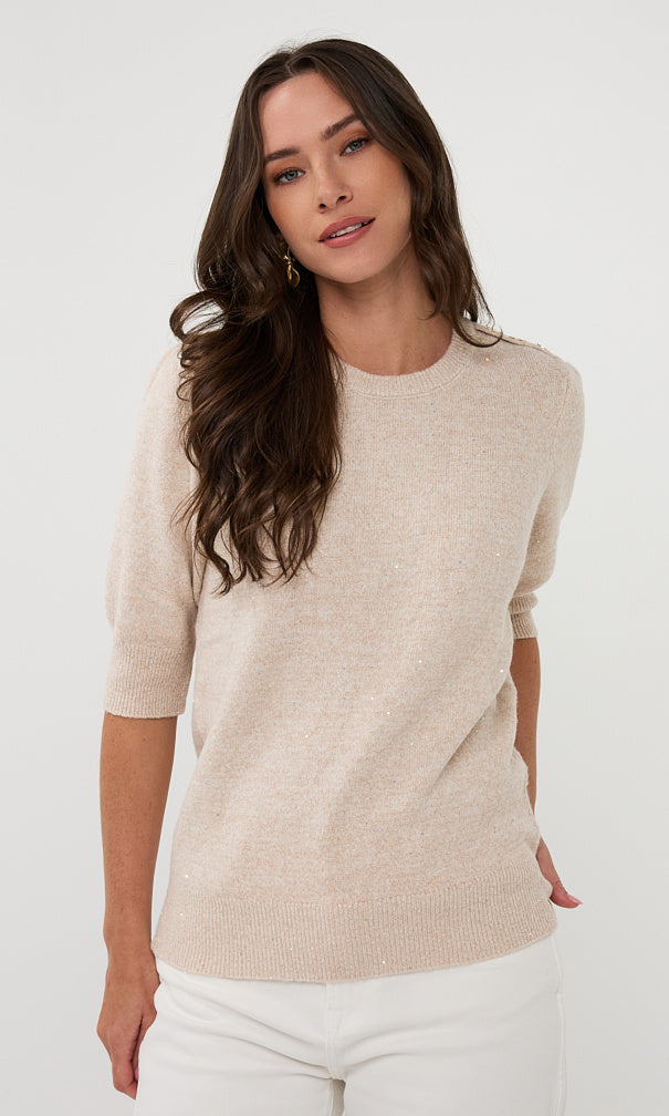 This soft beige knit top blends simplicity with subtle sophistication. Designed with a fine sparkle thread woven through, it brings a touch of understated shimmer to an everyday classic. The half sleeves feature gentle gathers at the shoulder for a feminine silhouette, while ribbed trim adds polished structure to the hem, cuffs, and neckline.